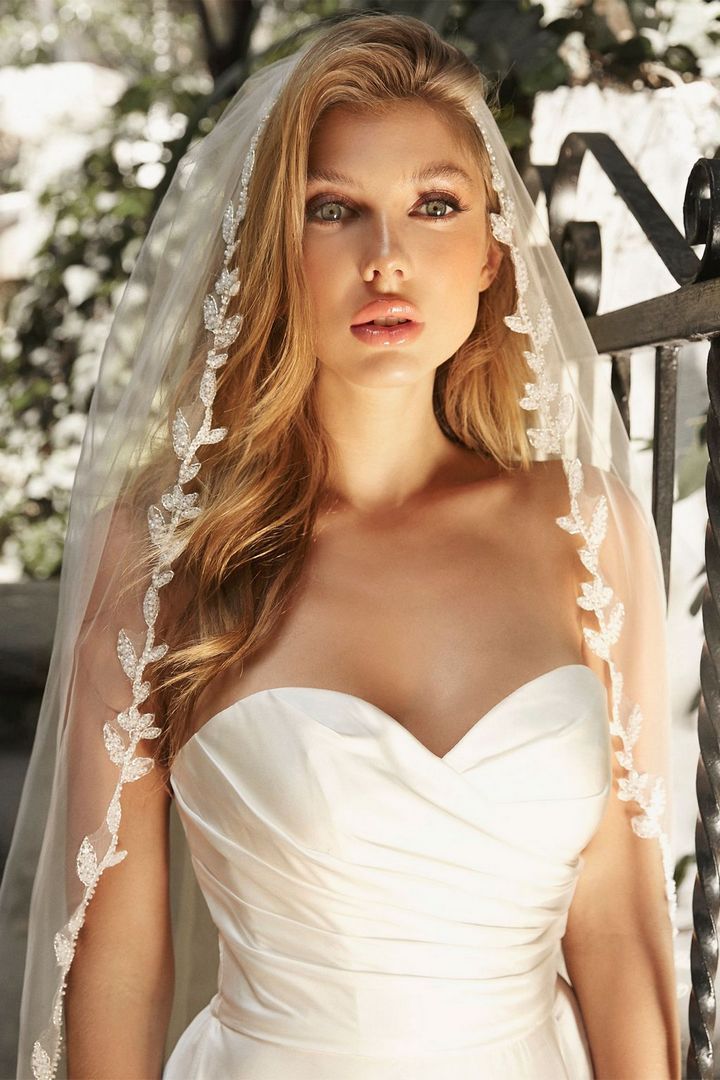 V-Neckline: Brides who choose this type of neckline want to achieve a look that elongates their necks. You can complement this cut with a clean updo like a bug or chignon secured higher on the head to emphasize the neck. Another hairstyle perfect for V-neck dresses is a side-sweep curls that looks perfect with the angular cut of the dress. As for the cascading curls, it adds texture as well as movement.