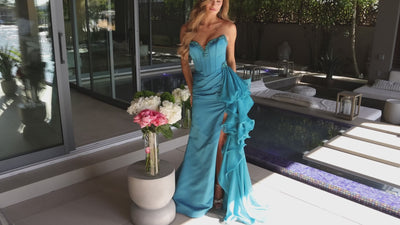 This fitted evening gown offers a structured and elegant look with soft volume through the skirt. The strapless bodice features a sweetheart neckline edged with delicate beadwork, adding texture and a subtle highlight to the neckline. The bodice is structured with visible boning for support and a defined waist shape. Below the waist, the skirt is designed with smooth draping and a high side slit for easy movement. A cascading ruffle detail adds flow and softness along the slit, giving a graceful finish. The gown is fully lined for comfort and secured with a back zipper. Works well if you want a defined waist and structured top with soft movement through the skirt.