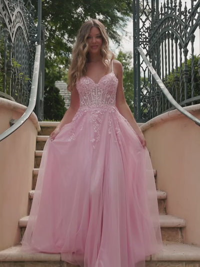 This is a long A-line gown designed for prom, formal dances, and evening occasions. The silhouette has a fitted bodice with a flowing skirt for easy movement. The neckline is a sweetheart style supported by thin straps. The bodice has visible corset-style boning with embroidered lace appliqué over sheer mesh, giving structure and coverage. The skirt is made of layers of soft tulle that fall to the floor without heaviness. The back has a lace-up tie closure for adjustability. The fabric has little to no stretch but the structure of the corset and lace-up back provide some flexibility. This style works well if you want waist definition with freedom at the skirt.