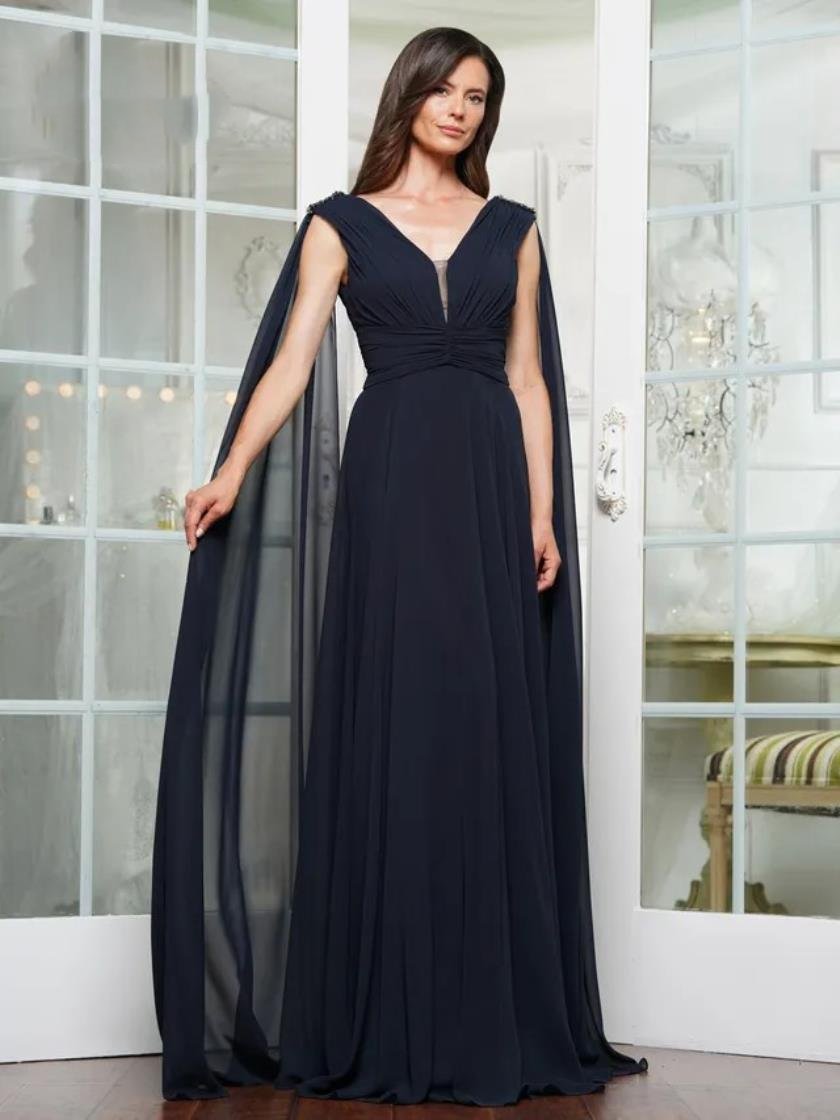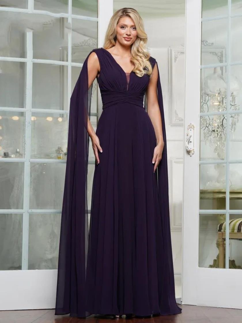 Command the room in the Marsoni MV1349 Fitted Evening Dress. This full-length chiffon gown features an elegant cape sleeve that drapes gracefully from the back shoulder, adding a touch of drama and sophistication. The fitted bodice flows into a full skirt, creating a timeless silhouette that’s perfect for formal events. This dress offers a stunning blend of classic style and modern flair.