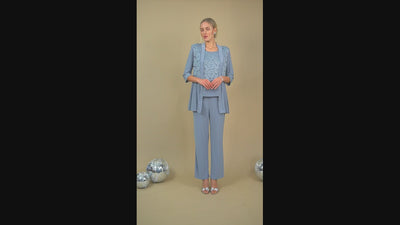 Stunning mother of the bride pant suit dress. This textured metallic mock three-piece pantsuit is designed for effortless coordination, with the look of a separate top and jacket. Perfect for formal, evening party or any special occasion.