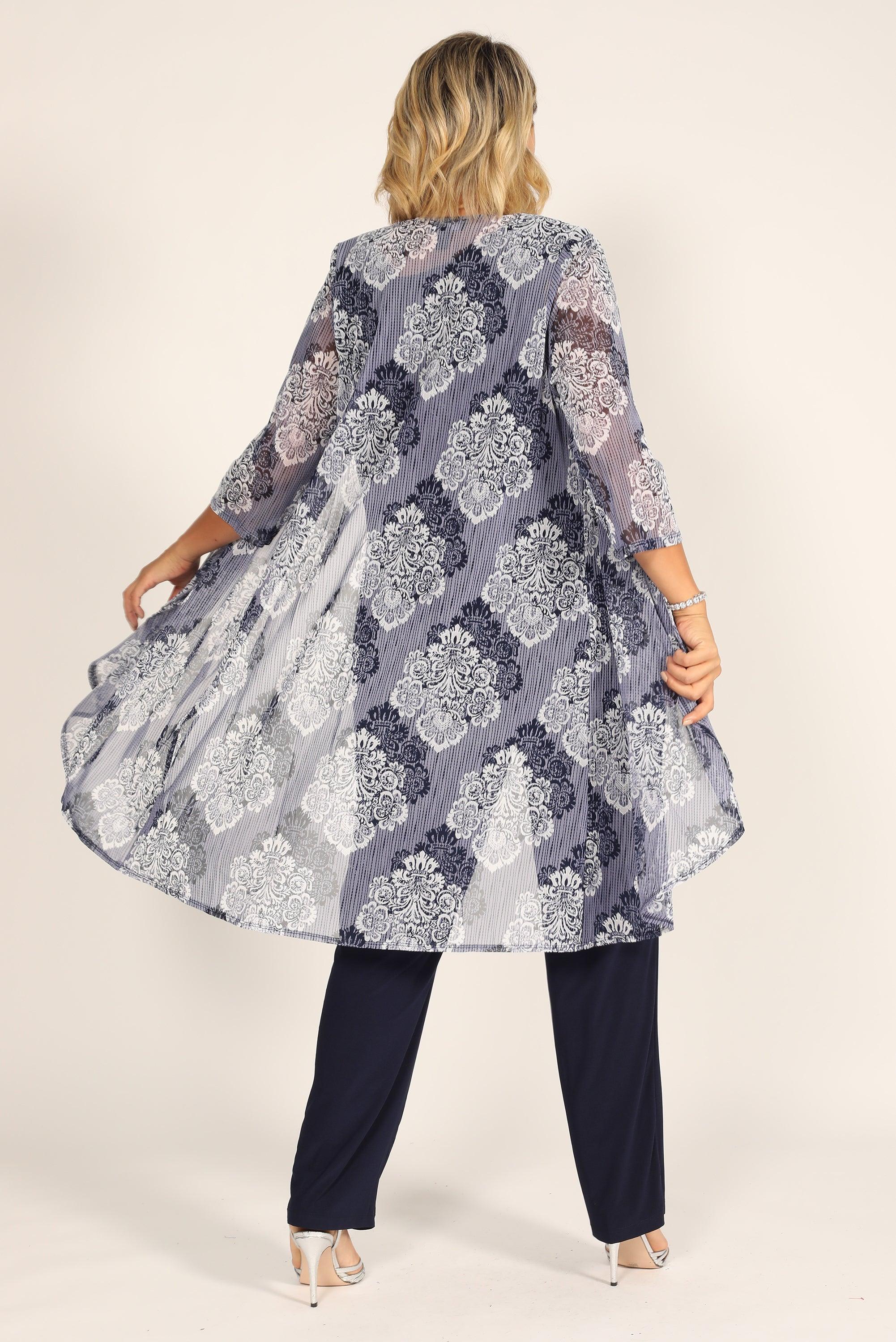 This stunning mother of the bride pant set features 3/4 length sleeves and a printed mesh jacket. Perfect for any special occasion.