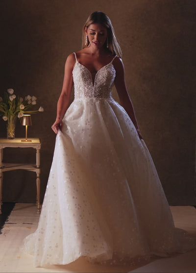 This Rachel Allan bridal gown is designed for brides who want a classic silhouette with soft detail. The dress features a fitted bodice with thin straps and a plunging neckline that provides structure while still feeling light. The bodice is sheer in parts and decorated with beaded embellishments, adding gentle definition at the waist. The skirt flows into a full A-line, giving comfort and movement while walking or sitting. A floor-length hem and sweeping train create a balanced proportion for most body types. The gown is fully lined for coverage and ease. This style works well if you want a defined waist with the comfort of a flowing skirt.