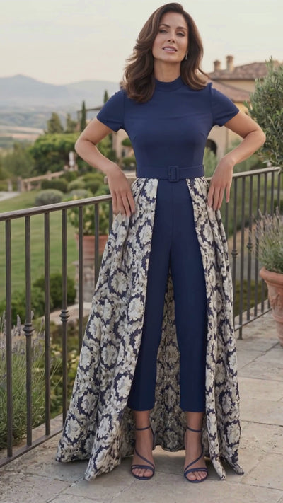 Stretch Crepe Jumpsuit Formal Floral Jacquard Overlay Skirt